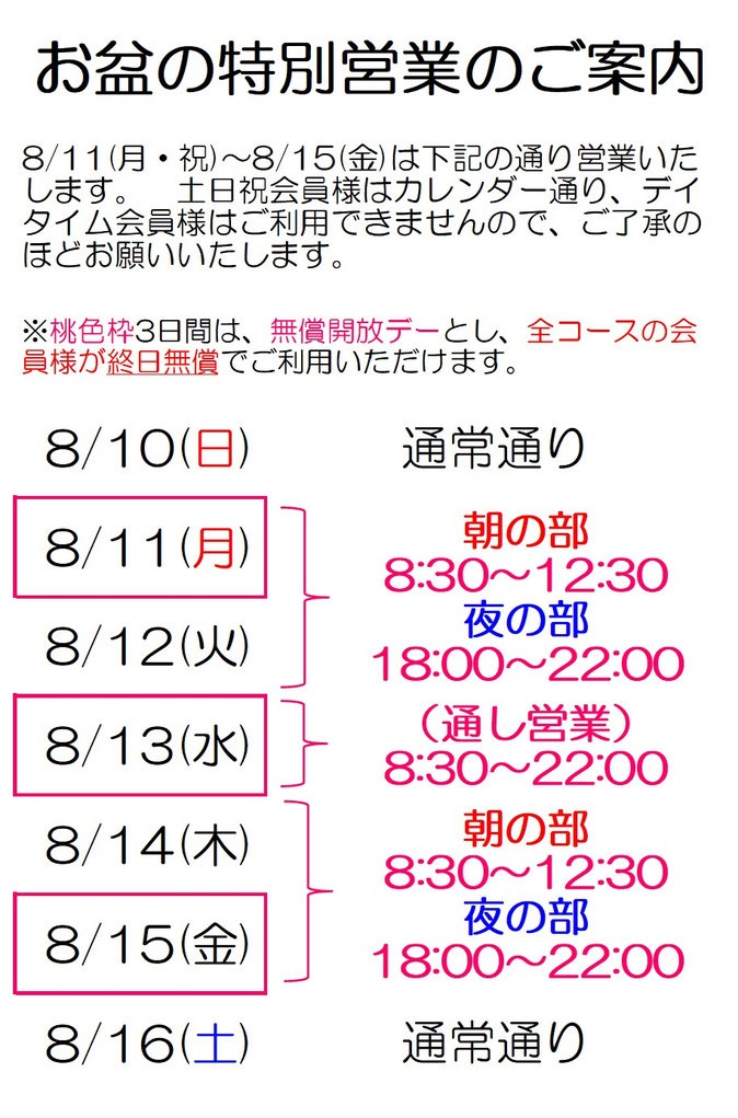 今年は下記の通り祝日のみを9~22時の通し営業にて行います。